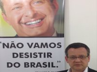 Nesta tarde, o candidato postou em seu perfil no Instagram uma foto ao lado de um banner com o rosto de Eduardo Campos e a frase “Não vamos desistir do Brasil”.