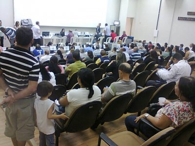 Para tentar agilizar o atendimento, a prefeitura ocupou todo o auditório Paulo de Tarso da Silva com cadeiras e disponibilizou dois atendentes para tentar agilizar o atendimento dos contribuintes que estão prejudicados com a falha no sistema de nota fiscal.