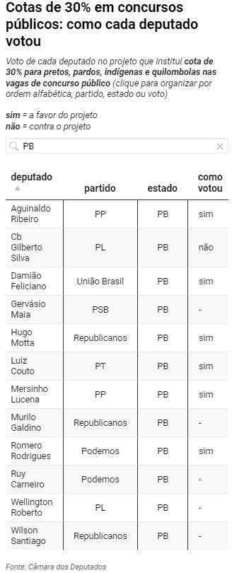 A Câmara dos Deputados aprovou na última terça-feira (19) por 241 votos a 94, com duas abstenções, o projeto de lei que aumenta de 20% para 30% a reserva de vagas em concursos públicos federais para pessoas pretas ou pardas, além de aumentar o alcance das cotas para indígenas e quilombolas. O texto, relatado na Casa pela deputada Carol Dartora (PT-PR), volta para o Senado Federal, onde passará por mais uma votação. Dos doze deputados federais paraibanos, apenas um votou contra, seis foram favoráveis e cinco se ausentaram de votar,