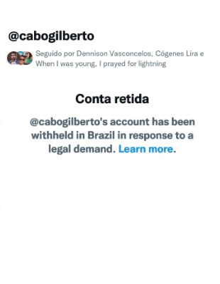 O deputado estadual bolsonarista e deputado federal eleito Cabo Gilberto (PL), nas eleições deste ano, teve a sua conta pessoal no Twitter suspensa na noite de ontem (8). Ao acessar o perfil, a mensagem que se encontra é a de que “a conta @cabogilberto foi retida no Brasil em razão de uma determinação judicial”.
