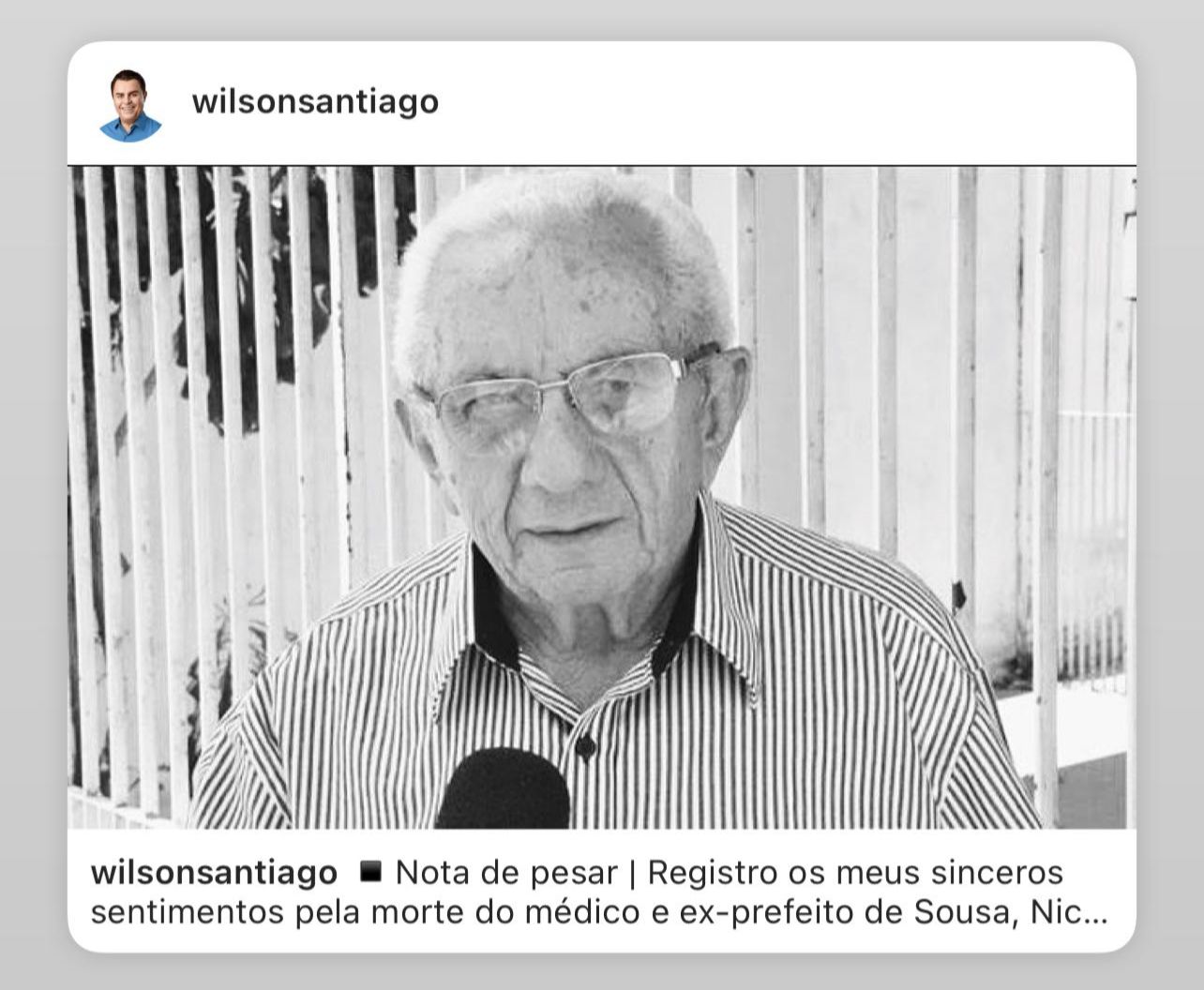 O deputado federal Wilson Santiago (Republicanos) publicou, na tarde desta segunda-feira (13), uma nota de pesar pela morte do médico e ex-prefeito de Sousa, Nicodemos Gadelha, conhecido por Dr. Cozinho, que faleceu em Sousa aos 82 anos.