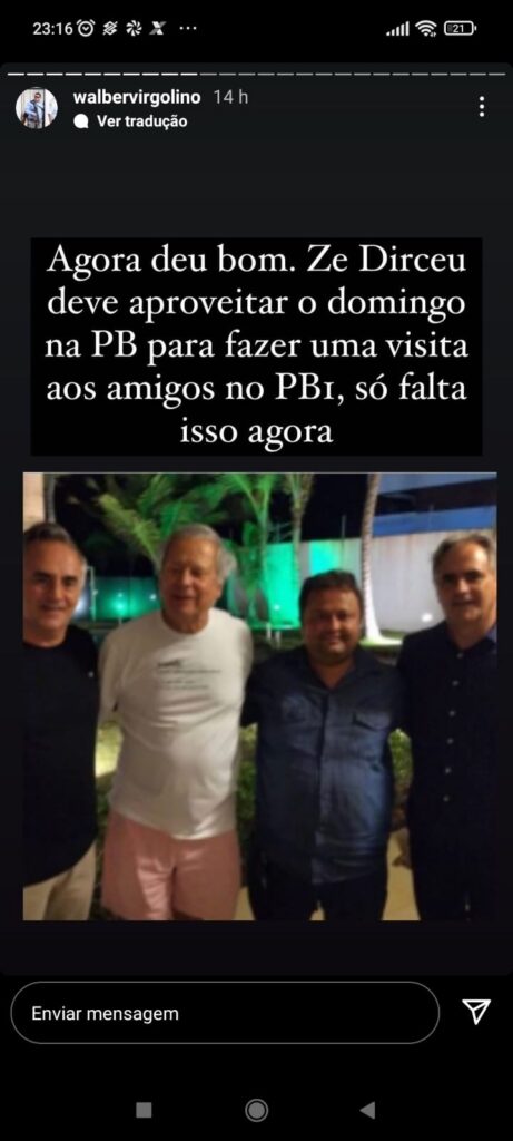 Na publicação, Wallber ironizou: “Zé Dirceu deve aproveitar o domingo para fazer uma visita aos amigos do PB1”, referindo ao Presídio de Segurança Máxima na Paraíba.