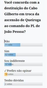 A destituição do deputado federal Cabo Gilberto do Partido Liberal não agradou à maioria dos internautas que responderam à enquete elaborada pelo PB Agora.
