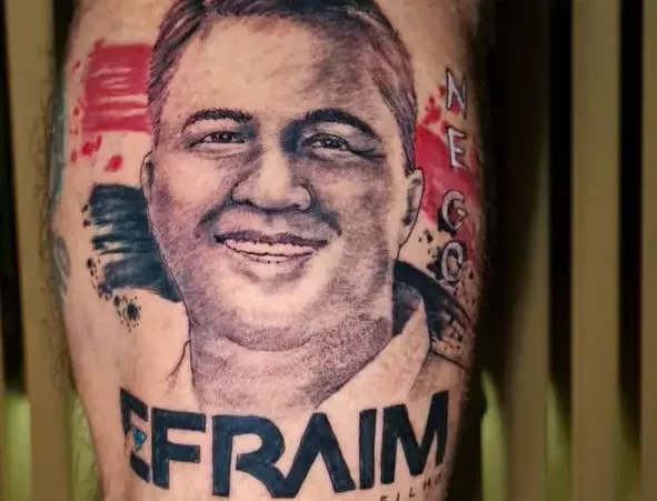 Não satisfeito apenas com o voto nas urnas, o rapaz fez uma tatuagem com o roesto de Efraim na panturrilha. Nos detalhes da tatuagem, o nome do senador eleito e as cores da bandeira da Paraíba, vermelho e preto, acompanhado do ‘Nego’.