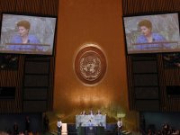 Nos Estados Unidos, a presidente entrou para a história da Organização das Nações Unidas (ONU) como a primeira mulher a fazer o discurso de abertura da 66ª Assembleia Geral, no dia 21 de setembro, em Nova York (EUA). Em sua fala, a presidente brasileira defendeu o estado palestino, exaltou o papel das mulheres na política e demonstrou a preocupação do Brasil com a crise econômica internacional.