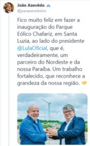 Em seu perfil no Twitter, o chefe do Executivo paraibano disse estar “muito feliz em fazer a inauguração (…) ao lado do presidente Lula, que é, verdadeiramente, um parceiro do Nordeste e da Paraíba”, escreveu João.