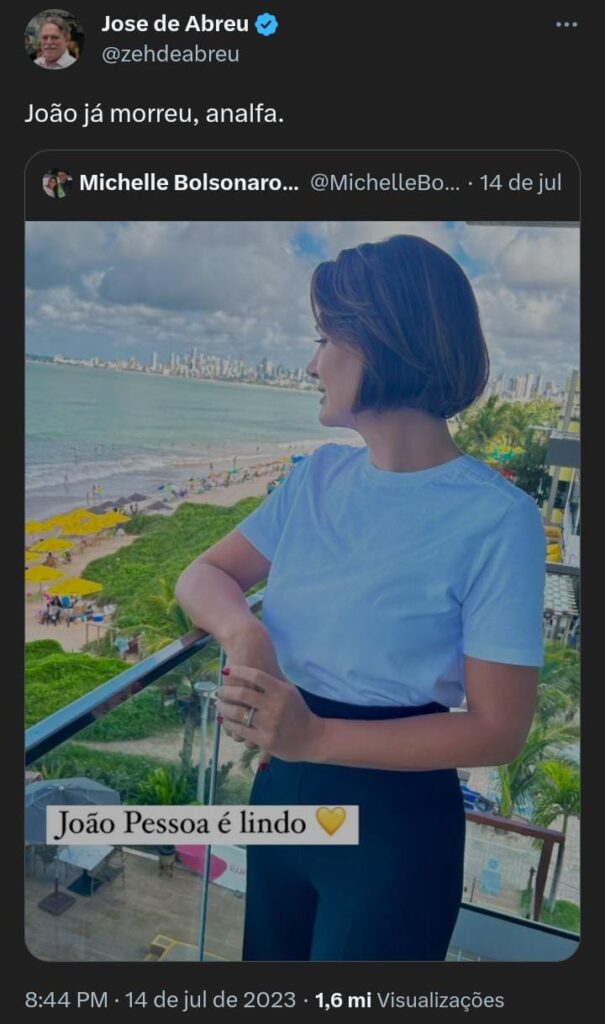 O ator petista José de Abreu não deixou passar. Abreu repostou a publicação de Michelle Bolsonaro e legendou: “João já morreu, analfa”, referindo-se ao político paraibano que dá nome a cidade.