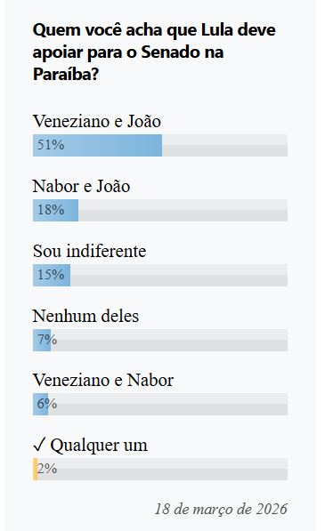 Uma enquete realizada pelo portal PB Agora, lançada no dia 18 de março de 2026, e que continua ativa, buscou saber a opinião dos internautas a partir da seguinte pergunta: “Quem você acha que Lula deve apoiar para o Senado na Paraíba?”. Diante das opções apresentadas, os participantes precisavam escolher entre diferentes combinações de nomes colocados no cenário político estadual.