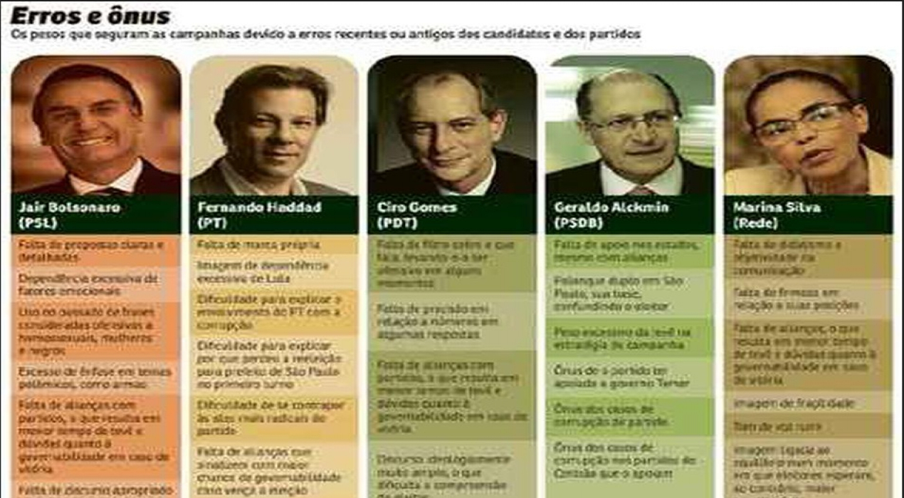 Ninguém se salva, ao menos por ora. Todos os candidatos a presidente da República vêm cometendo erros que reduzem as chances de passar para o segundo turno ou, no mínimo, reduzem a vantagem de quem está nas melhores posições, apontam analistas. Alguns desses problemas são estruturais — até mesmo intrínsecos à própria personalidade de cada um. Outros, não menos difíceis, têm origem em decisões tomadas no início da campanha. Há ainda os que podem ser resolvidos. Afinal, restam 18 dias para o pleito.