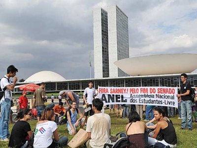 Em Brasília, estudantes ocuparam nesta sexta-feira (21) a frente do Congresso Nacional, em mais uma manifestação contra a permanência do senador José Sarney (PMDB-AP) como presidente da Casa. Nesta semana, o Conselho de Ética arquivou todas as 11 ações contra Sarney (Foto: José Cruz/Agência Brasil)