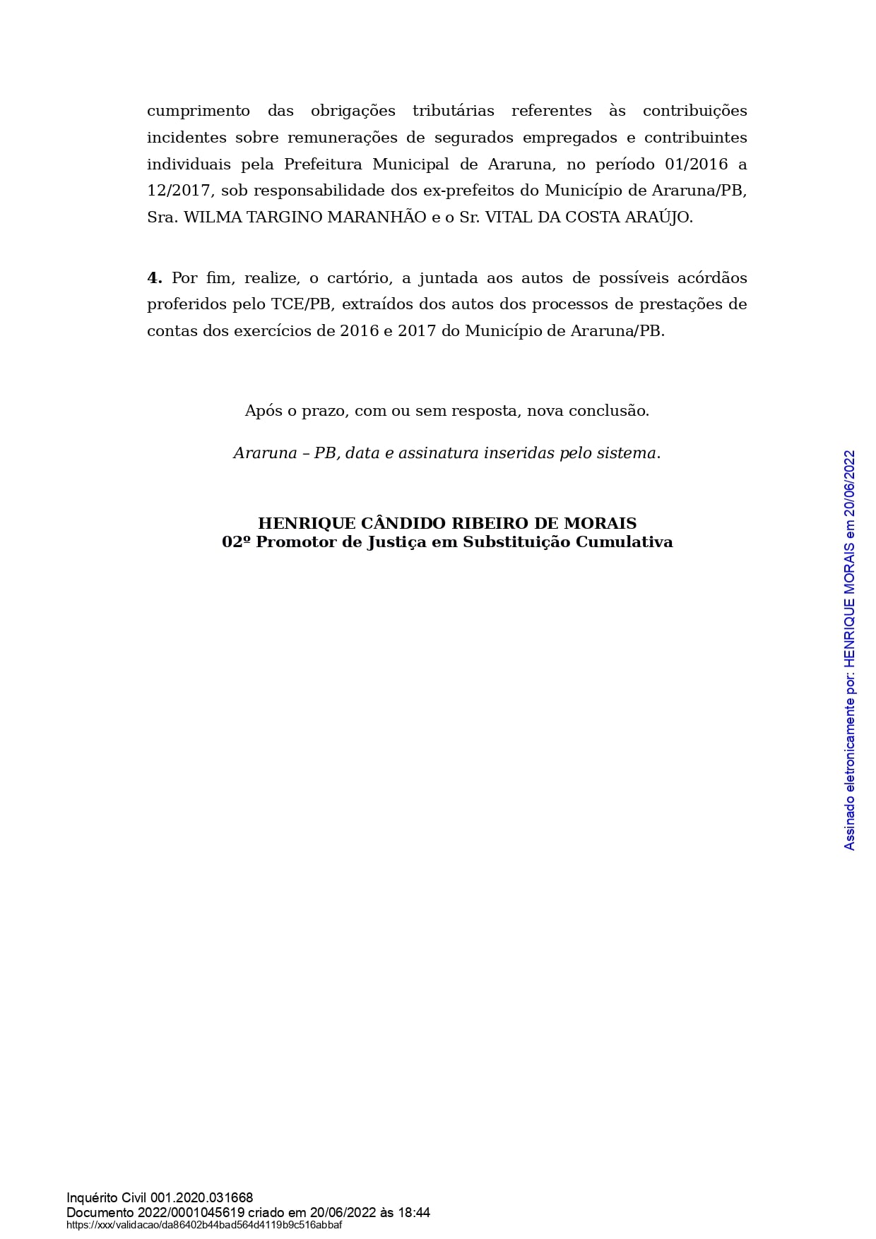 Por fim, realize, o cartório, a juntada aos autos de possíveis acórdãos proferidos pelo TCE/PB, extraídos dos autos dos processos de prestações de contas dos exercícios de 2016 e 2017 do Município de Araruna/PB. As informações são do portal Repórter PB.