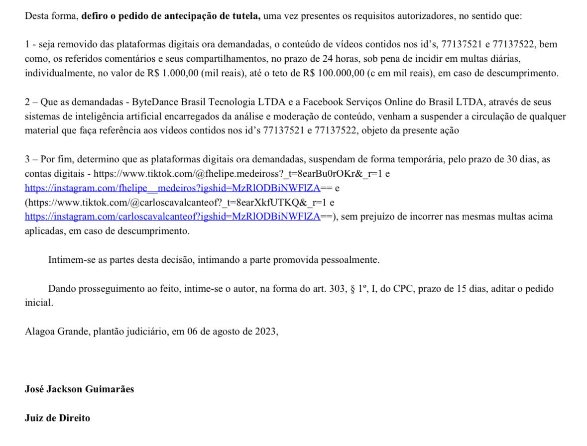 Na decisão, o juiz ainda determina a suspensão por 30 dias de dois perfis que “influenciadores” que se aproveitaram dos conteúdos mentirosos para tentar angariar seguidores e engajamento, sob pena de multa de até cem mil reais.