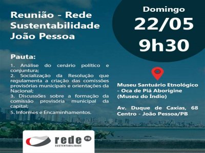 A análise do cenário político e conjuntura, a organização partidária no município, bem como as discussões sobre a formação da comissão provisória de João Pessoa serão os principais assuntos da reunião que os filiados da Rede Sustentabilidade na capital promoverão no próximo domingo, 22 de maio – 09h30, nas dependências do Museu Santuário Etnológico – Oca de Piá Aborígine (Museu do Índio), localizado na Av. Duque de Caxias, 68 – Centro.