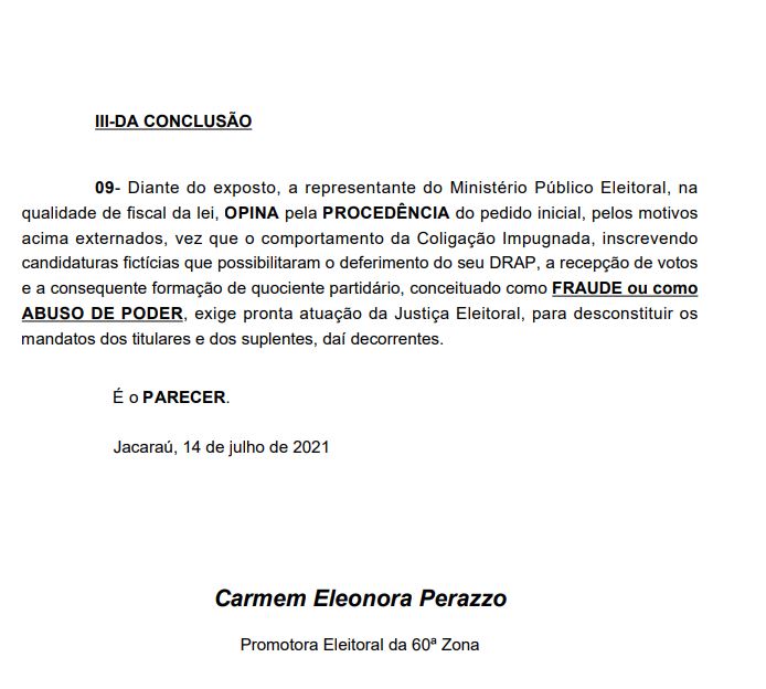 – Diante do exposto, a representante do Ministério Público Eleitoral, na qualidade de fiscal da lei, OPINA pela PROCEDÊNCIA do pedido inicial, pelos motivos