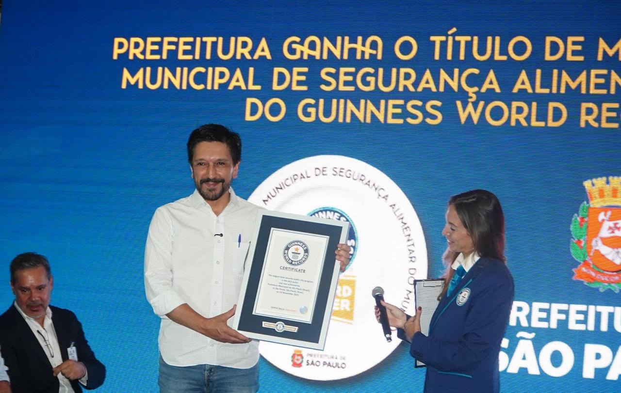 A gestão do prefeito de São Paulo Ricardo Nunes, recebeu nesta quarta-feira (3/12) o título do GUINNESS WORLD RECORDS™ de maior programa municipal de segurança alimentar do mundo, tornando-se a primeira cidade do mundo com reconhecimento nesta categoria. A conquista, que estabelece o modelo paulistano como referência internacional, reconheceu a política pública permanente da capital paulista de acesso digno e contínuo à alimentação para a população. O recorde foi estabelecido após auditoria do Guiness comprovar a distribuição de 933,8 toneladas de alimentos em 24 horas. A Prefeitura de São Paulo distribui mais de 3 milhões de refeições por dia.