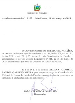 Na tarde desta terça-feira (18), o governador João Azevêdo (PSB) nomeou Alanna Galdino como nova conselheira do Tribunal de Contas do Estado. O nome de Alanna foi aprovado pela Assembleia Legislativa da Paraíba durante sessão ordinária realizada na manhã de hoje.