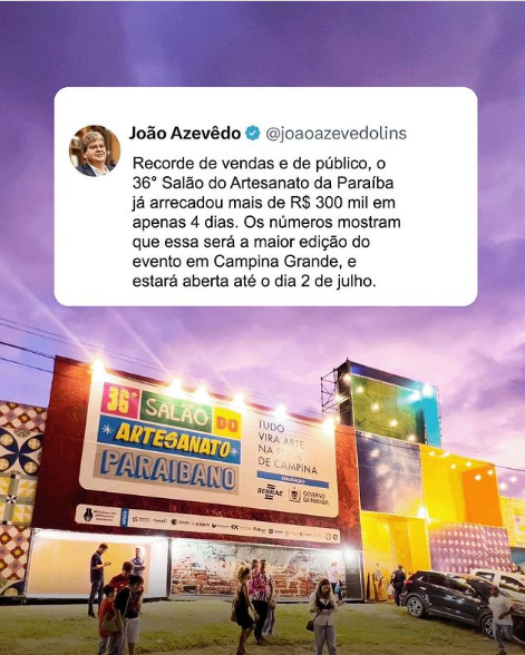 “Recorde de vendas e de público, o 36° Salão do Artesanato da Paraíba já arrecadou mais de R$ 300 mil em apenas 4 dias. Os números mostram que essa será a maior edição do evento em Campina Grande, e estará aberta até o dia 2 de julho”, disse João.