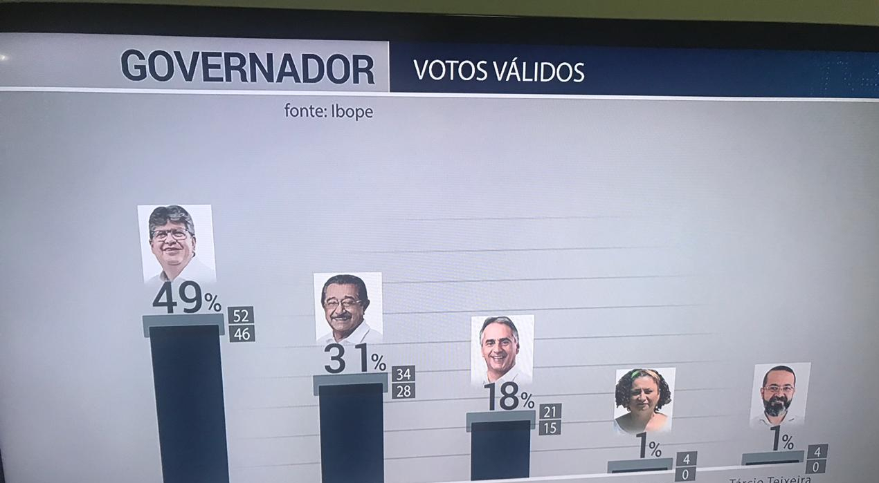 Pesquisa Ibope divulgada nesta sexta-feira (5) aponta os seguintes percentuais de intenção de votos válidos para o governo da Paraíba. A margem de erro é de 3 pontos percentuais para mais ou para menos.