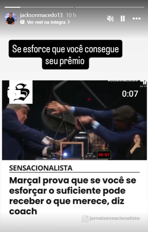 Ao compartilhar a publicação, Jackson Macêdo também fez questão de adotar um tom irônico, escrevendo: “Se esforce que você consegue o seu prêmio”. A frase faz alusão ao discurso típico de coaches que incentivam a busca pelo sucesso a qualquer custo, fazendo uma crítica velada à postura de Marçal e de figuras semelhantes no cenário político.