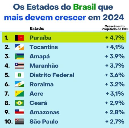 De acordo com o levantamento feito pela instituição, o PIB da Paraíba deve ficar acima dos 4,7%. Cerca de 0,6% a mais que o segundo colocado, o estado do Tocantins.