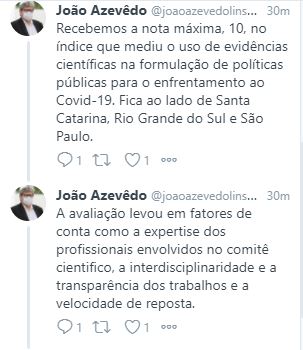 Em sua postagem, João explicou que o Estado recebeu a nota máxima, 10, no índice que mediu o uso de evidências científicas na formulação de políticas públicas para o enfrentamento à covid-19, ficando ao lado de estados como Santa Catarina, Rio Grande do Sul e São Paulo.