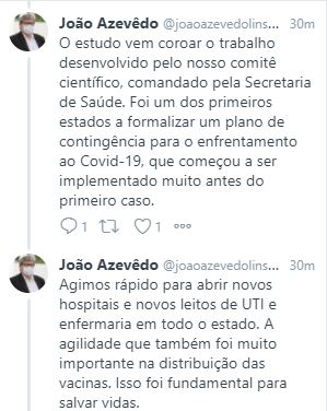 “Agimos rápido para abrir novos hospitais e novos leitos de UTI e enfermaria em todo o estado. A agilidade que também foi muito importante na distribuição das vacinas. Isso foi fundamental para salvar vidas”, escreveu João.