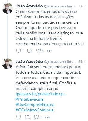 O governador ressaltou ainda que toda ação e medida adotadas foram pautadas na ciência. Ele agradeceu aos profissionais de saúde, que estiveram na linha de frente no combate à doença. “A Paraíba será eternamente grata a todos e todos. Cada vida importa. É isso que a acredito e que continuo defendendo até a final”, postou o governador.