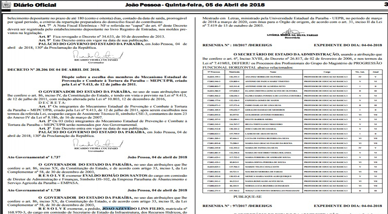 O governador Ricardo Coutinho (PSB) publicou no Diário Oficial desta quinta-feira (5), a exoneração do secretário de Recursos Hídricos e Meio Ambiente, João Azevedo, que deixa a pasta para disputar o Governo do Estado, pelo PSB.