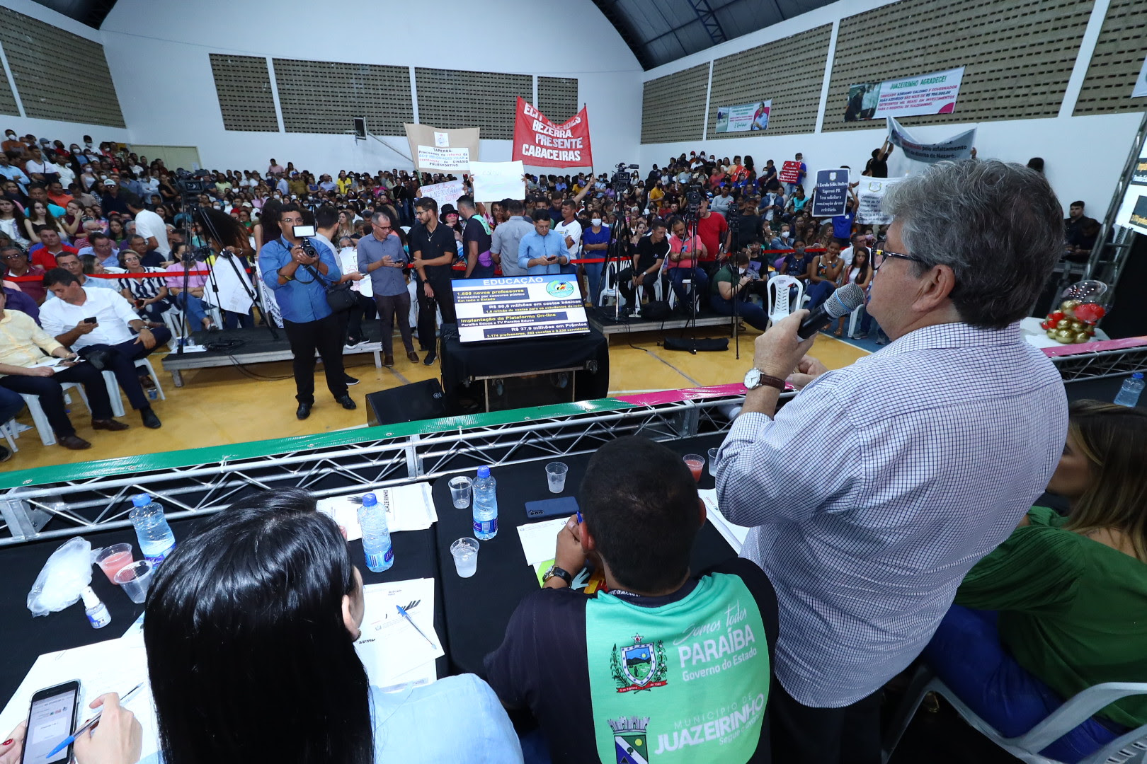 O governador João Azevêdo participou, na noite desta quinta-feira (9) na cidade de Juazeirinho (3ª Região Geoadministrativa), da audiência pública regional do Orçamento Democrático Estadual, onde assinou ordens de licitação e de serviço, fez entrega de equipamentos, destinou créditos do programa Empreender Paraíba, prestou contas das ações do governo no Estado e na região, e ouviu as reivindicações da população. Educação, esgotamento sanitário e desenvolvimento humano foram as prioridades eleitas na audiência.