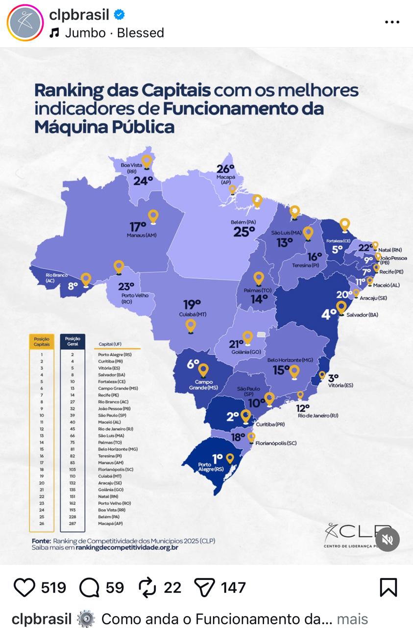 O levantamento nacional realizado pelo Ranking de Competitividade dos Municípios (acesse: rankingmunicipios.org.br), divulgado ontem pelo Centro de Liderança Pública, que avaliou o pilar de Funcionamento da Máquina Pública, entre todas as capitais brasileiras, apontou que a capital paraibana está na 4ª posição no Nordeste e na 9ª posição nacional em eficiência da sua gestão.
