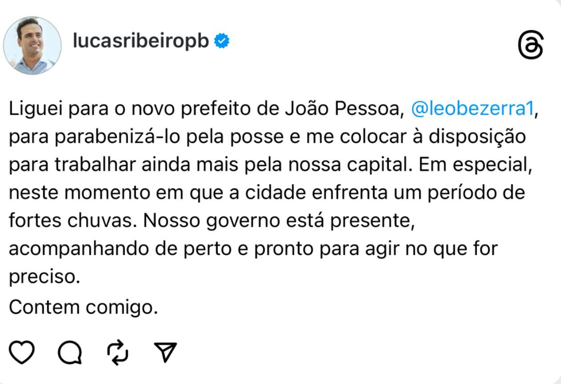 “Liguei para o novo prefeito de João Pessoa, Léo Bezerra, para parabenizá-lo pela posse e me colocar à disposição para trabalhar ainda mais pela nossa capital. Em especial, neste momento em que a cidade enfrenta um período de fortes chuvas”, escreveu o governador.