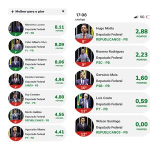 Entre os parlamentares paraibanos, aparece em segundo lugar Cabo Gilberto (PL) com 8,09 de nota, e em terceiro Wellington Roberto (PL), obtendo uma pontuação de 8,06.