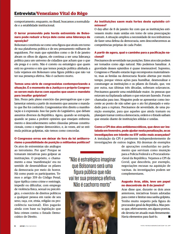 Noutra indagação, se teria falado com o governador do DF, o emedebista paraibano disse: “Tentei falar com Ibaneis e não tive êxito. Liguei, então, para o secretário da Casa Civil, que me atendeu muito bem e, categoricamente, me assegurou que o cenário estava sob controle, porque as devidas precauções haviam sido adotadas pelas forças locais de segurança. Ele chegou ao ponto de mencionar que seriam manifestações não numerosas. Citou 400 pessoas. Listou, como medidas, o bloqueio de acesso dos militantes às três sedes do Poder. Reiterei as preocupações da Polícia Legislativa e pontuei a presença de mais de 100 ônibus, o que poderia, numa conta bem rápida, significar mais de 4 mil pessoas. Era delicado porque a Polícia Legislativa do Senado não dispunha de contingente para fazer uma contenção, se houvesse má intenção dos manifestantes, o que terminou por acontecer. Desliguei o telefone e passei as informações para Rodrigo Pacheco. Falei à Polícia Legislativa que ficasse tranquila, porque havia a garantia do GDF que nada aconteceria. Quatro horas depois, fomos todos surpreendidos. Me recordo bem que o chefe-adjunto, Gilvan, me ligou por volta de 13h30 e desligou atônito quando a invasão estava acontecendo”, disse Veneziano ao destacara ainda que no seu ver houve sim negligencia do governador do DF: “A meu ver, sim. Não há outra constatação possível que não essa”, veja mais detalhes da entrevista:IE2763pag4a6_VERMELHAS
