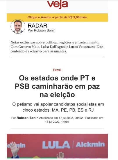 Informação publicada na coluna Radar, da Veja, na edição deste domingo (17) aponta que PT e PSB vão caminhar juntos na Paraíba e em outros quatro estados da federação. Segundo o informe, depois de muitas brigas locais, PT e PSB devem bater o martelo nesta semana sobre as definições o que fará com que palanques sejam enfim pacificados.
