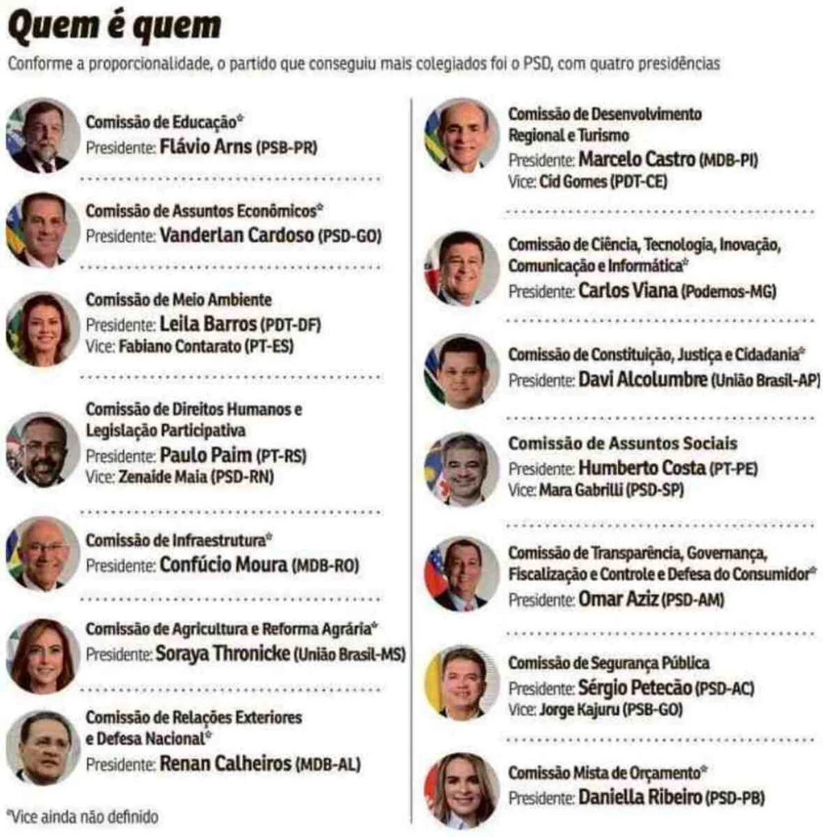 A matéria traz que a presidência da Comissão Mista de Orçamento (CMO, uma das mais importantes da Casa, ficou com a senadora Daniella Ribeiro. Noutro ponto da matéria traz que o senador Otto Alencar (BA), líder do PSD, comemorou as formações. “Conseguimos dividir os partidos em dois blocos volumosos, uma posição majoritária bem confortável para matérias de maioria qualificada de interesse do governo”, comentou. Perguntado se é seguro para o Planalto confiar nos votos do União Brasil, com parlamentares que já declararam abertamente não estarem fechados com o governo, o parlamentar disse que sim.