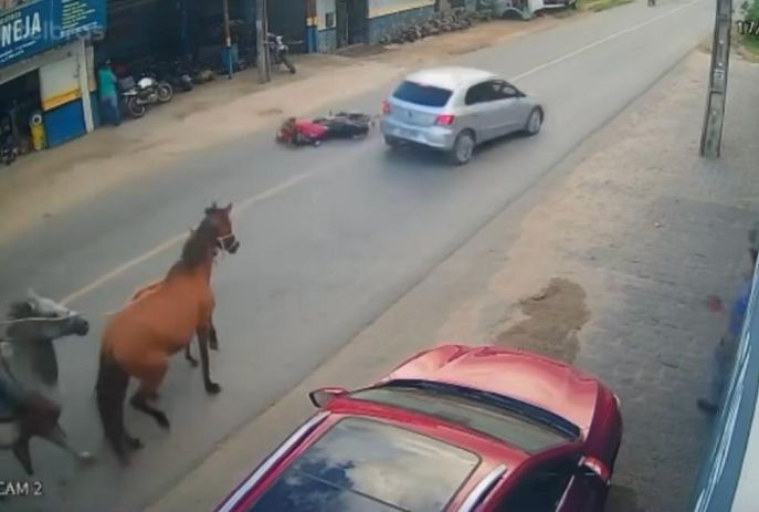 Câmeras de segurança registraram o momento da colisão. Pelas imagens, é possível ver que o carro envolvido no acidente invadiu a faixa contrária quando tentava desviar de cavalos na pista.