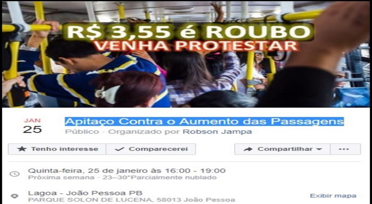 Insatisfeitos com o aumento no preço da passagem de ônibus, usuários do transporte público de João Pessoa estão se mobilizando nas redes sociais para realizar um protesto contra o reajuste autorizado pela Prefeitura Municipal de JP. O ato está programado para acontecer na próxima quinta-feira (25), a partir das 16h, no Parque da Lagoa.