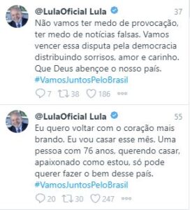 Em seu perfil numa rede social, Lula declarou que pretende voltar ao cargo de presidente com o “coração mais brando”. Uma pessoa com 76 anos, querendo casar, apaixonado como estou, só pode querer fazer o bem desse país”, pontou o ex-presidente.