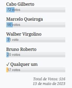 Com 4% dos votos ficou Bruno Roberto. A opção ‘Qualquer um’ foi a opção escolhida por apenas 17, dos mais de 500 votos que a enquete recebeu.
