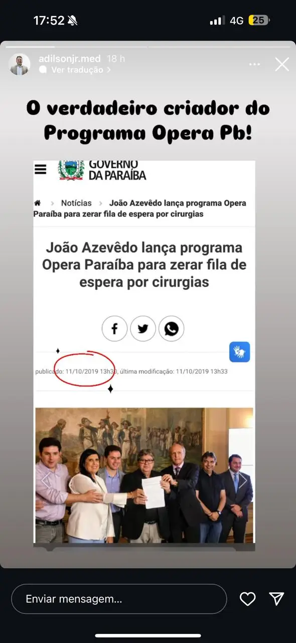 O genro do governador compartilhou uma foto de 2019, em uma postagem que rapidamente ganhou destaque nas redes sociais. A imagem mostra uma matéria que atribui a João Azevêdo e a Geraldo Medeiros a criação e o lançamento do Opera Paraíba, ainda durante a gestão do então secretário de Saúde, Geraldo Medeiros. “O verdadeiro criador do Programa Opera PB”, destacou ele na publicação, reforçando a autoria do projeto ao atual governador e da gestão de Geraldo.