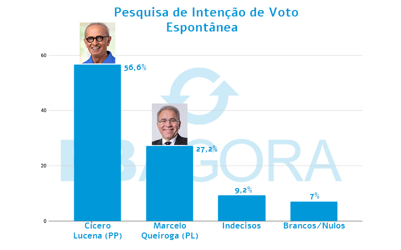No cenário espontâneo, onde os eleitores não são apresentados aos nomes dos candidatos, Cícero também mantém a liderança com 56,6%, seguido por Queiroga com 27,2%, que mantém o mesmo percentual da estimulada. Eleitores indecisos somam 9,2%, enquanto os votos brancos ou nulos representam 7%.