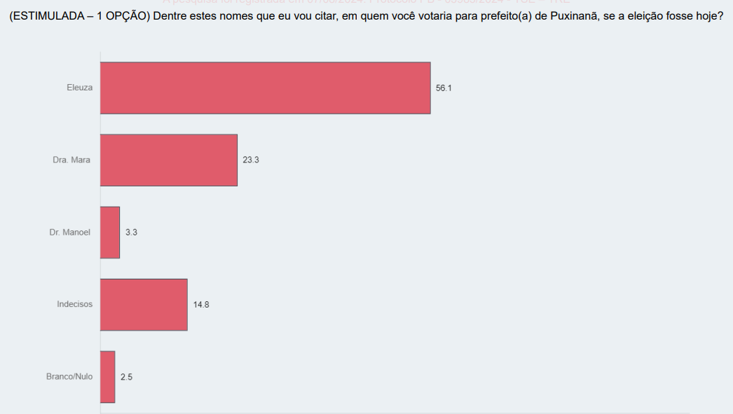 Pesquisa PB Agora/Datavox aponta que Eleuza (Republicanos) lidera a intenção de voto na modalidade estimulada em Puxinanã com 56,1%, seguida por Dra. Mara (MDB) com 23,3%.