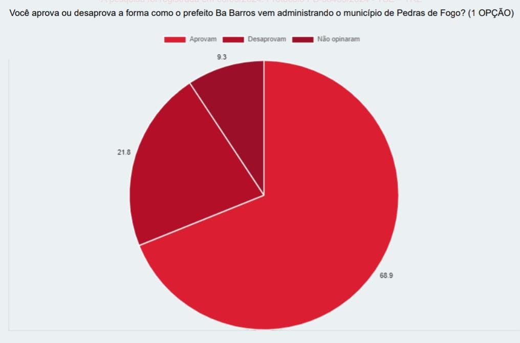Pesquisa realizada pelo Instituto Datavox, contratada pelo portal PB Agora e divulgada nesta quinta-feira (12), revelou que a maioria dos moradores de Pedras de Fogo aprova a gestão do atual prefeito Bá Barros. De acordo com os dados, 68,9% dos entrevistados disseram aprovar a forma como o prefeito vem administrando o município, enquanto 21,8% desaprovam sua gestão.