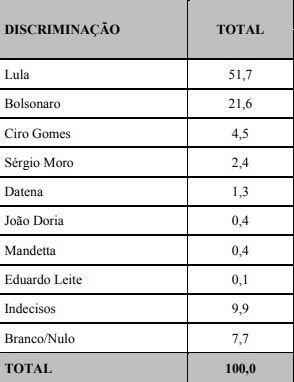 Neste cenário, a pesquisa foi realizada na modalidade estimulada (àquela em que o entrevistado opta pelas opções pré-definidas), onde, foram apresentados os nomes de Luiz Inácio Lula da Silva; Jair Boslonaro; Ciro Gomes com 4,5%; Sérgio Moro com 2,4%; Datena 1,3%; João Doria 0,4%; Mandetta 0,4%; Eduardo Leite 0,1%