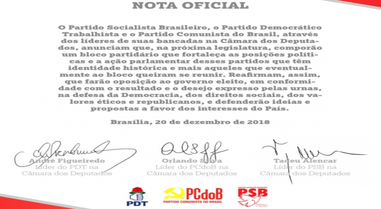 Como já haviam sinalizado no final de outubro, depois das eleições presidenciais, as bancadas do PDT, do PCdoB e do PSB na Câmara confirmaram nesta quinta-feira (20) a formação de um bloco de oposição ao presidente eleito Jair Bolsonaro (PSL) a partir de 1º de janeiro de 2019. O agrupamento oposicionista não incluirá o PT, para efeitos regimentais, como também já estava pré-definido.