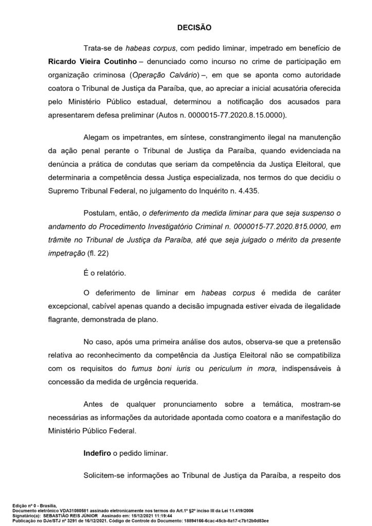 O pedido de liminar apresentado pela defesa do ex-governador Ricardo Coutinho para suspender a investigação no Tribunal de Justiça da Paraíba decorrente da Operação Calvário foi negado pelo Superior Tribunal de Justiça (STJ). A decisão é do ministro Sebastião Reis Júnior.
