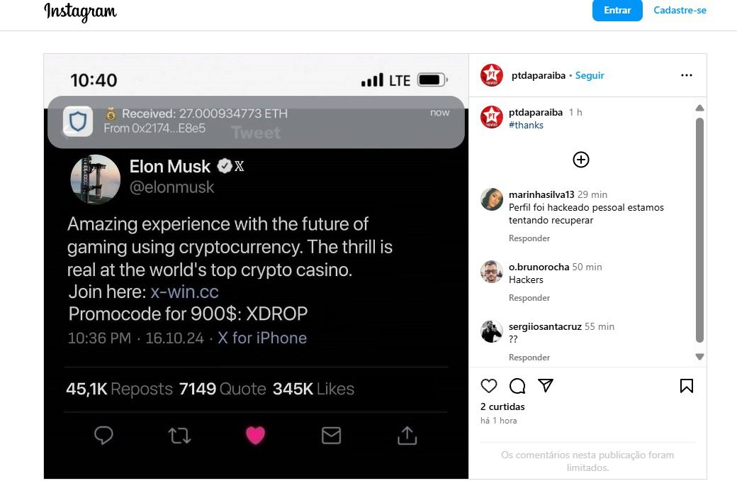 Na manhã desta segunda-feira (21), o perfil oficial do Partido dos Trabalhadores (PT) na Paraíba no Instagram sofreu um ataque hacker. A informação foi confirmada pelo presidente estadual da legenda, Jackson Macedo, que afirmou que a equipe de comunicação já está empenhada em recuperar o controle da conta.