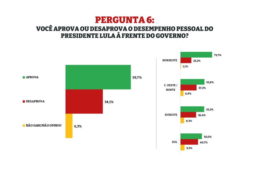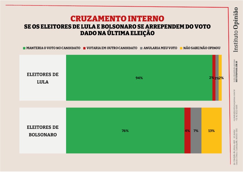 A pesquisa também indica que seis de cada dez brasileiros (59,7%) aprovam o desempenho pessoal de Lula. Entre os eleitores de Bolsonaro, a aprovação ao atual presidente é de 22%. De acordo com o levantamento, 11% dos eleitores de Bolsonaro não votariam nele hoje. Esse percentual é de 2% entre os apoiadores de Lula.