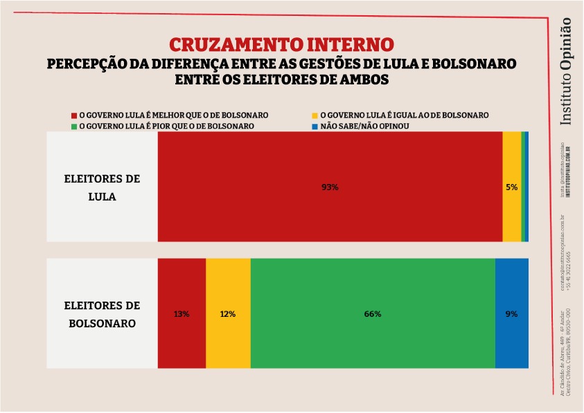 O entendimento de que o governo Lula é melhor que o de seu antecessor prevalece entre 93% dos eleitores do petista. Entre eles, 5% avaliam que o cenário é o mesmo. Já entre os apoiadores de Bolsonaro, 13% consideram que a atual gestão é melhor que a do ex-presidente. Outros 66%, no entanto, julgam que a administração federal piorou.