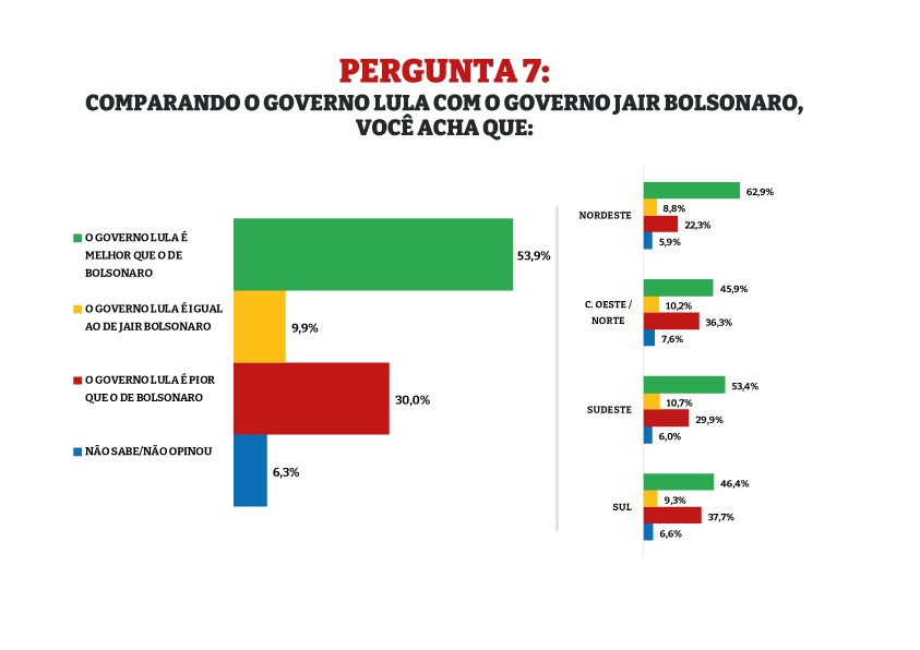 Um levantamento empírico do Instituto Opinião encomendada pelo portal Congresso em Foco revelou que 53,9% dos brasileiros avaliam que o governo Lula é melhor que o de Jair Bolsonaro. Na outra ponta, 30% consideram que a atual gestão é pior do que a anterior. Para 9,9%, é igual. O levantamento ouviu 2 mil eleitores entre os dias 16 e 19 de agosto em todo o país. A margem de erro é de dois pontos percentuais para mais ou para menos, com 95% de confiabilidade para o resultado geral.
